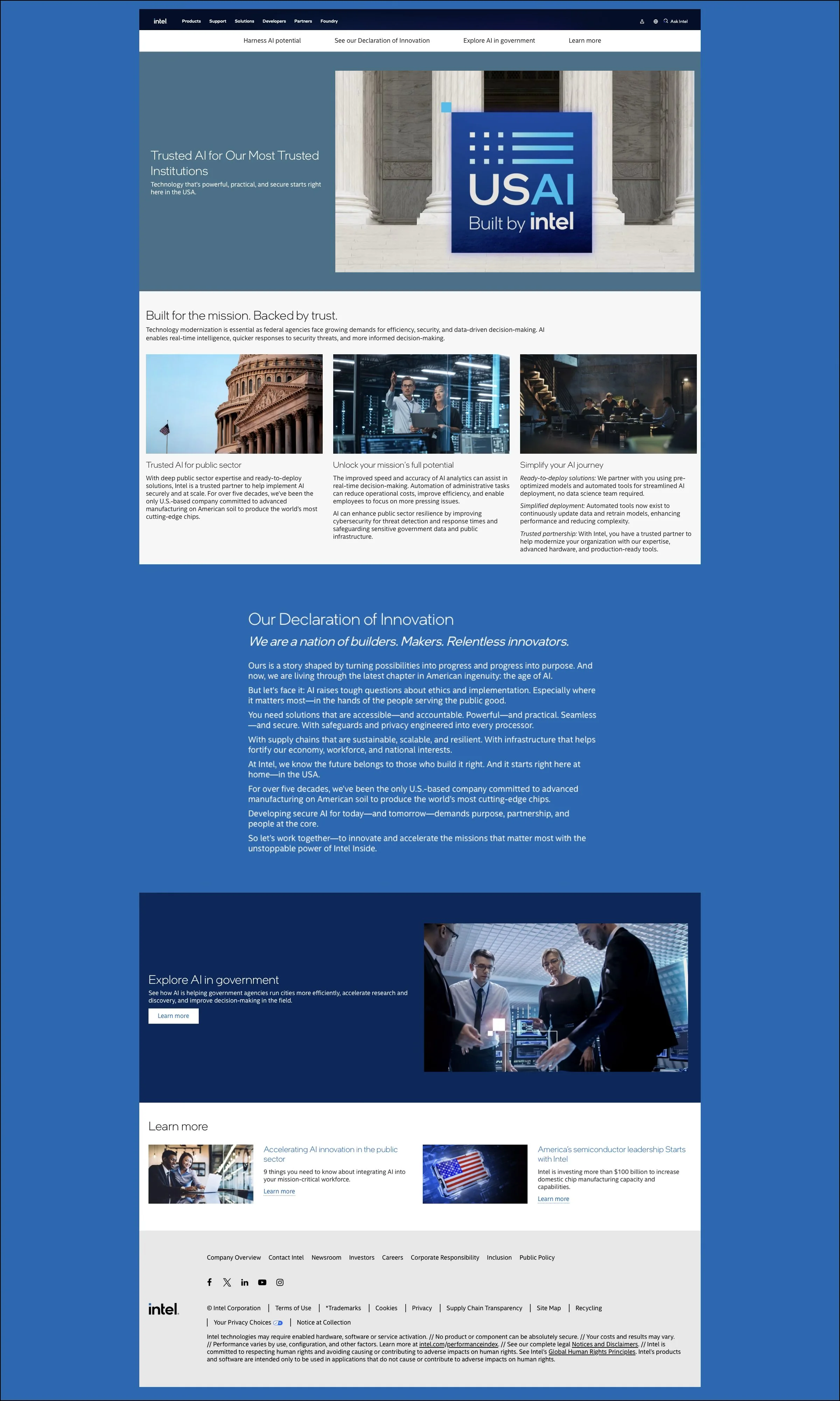 With over five decades of domestic manufacturing and government partnership, no company is more qualified to lead than Intel. And so, we developed a rallying cry for policymakers and military leaders to reclaim American authority in AI innovation: USAI.
